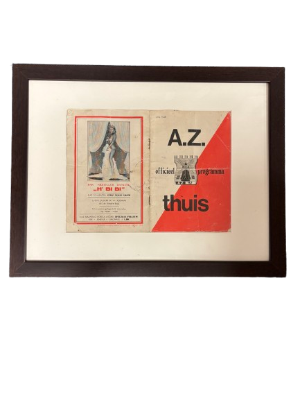 Ingelijst officieel wedstrijdprogramma van AZ voor een thuiswedstrijd, met aan de binnenzijde een originele advertentie uit Alkmaar. Een authentiek en karakteristiek document dat zowel het voetbal als het lokale uitgaansleven uit die periode weerspiegelt.