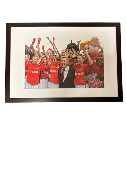 Ingelijste foto van de opening van het DSB Stadion in augustus 2006, vastgelegd tijdens de eerste wedstrijd van AZ tegen Arsenal. Te zien is een feestelijk moment met de jeugd en Dirk Scheringa, waarmee de start van een nieuw stadiontijdperk voor AZ wordt gemarkeerd.