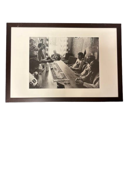 Ingelijste zwart-wit foto van een persconferentie van Willem van Hanegem in de bestuurskamer van De Hout. Een bijzonder moment uit de geschiedenis van AZ, vastgelegd in een sfeervolle en authentieke opname.