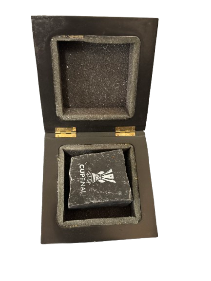Klein stenen blokje in presentatiebox met opschrift “Cup Final” en een trofee-embleem. Een aandenken aan de UEFA Cup finale.