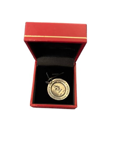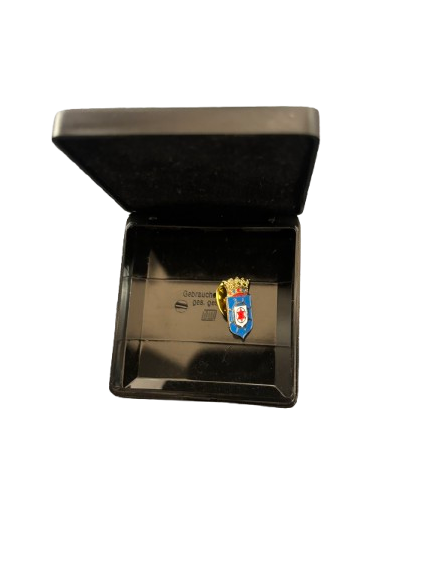Officiële speld in presentatiebox, afkomstig van de overheid van Bonaire. Uitgereikt als dankbetuiging voor de donatie van stadionstoelen van AZ aan het voetbalstadion op Bonaire.