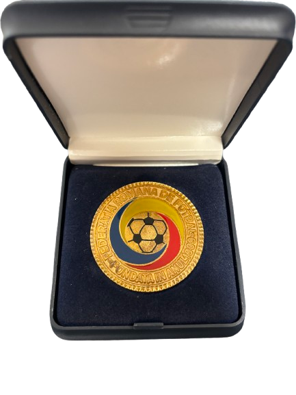 Officiële voetbalmedaille uit Roemenië, voorzien van een embleem met balmotief en nationale aanduiding. Geleverd in presentatiebox en afkomstig uit een internationale voetbalcontext.