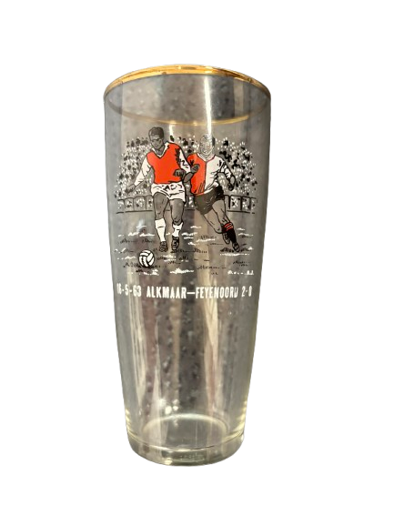 Herdenkingsglas van de wedstrijd Alkmaar – Feyenoord, gespeeld op 16 mei 1963, waarin de thuisploeg met 2–0 won. Het glas toont een illustratie van twee voetballers en verwijst naar dit historische duel in Alkmaar.