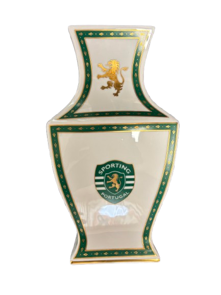 Decoratieve vaas van Sporting Portugal, uitgevoerd in keramiek met clublogo en goudaccenten. Een officieel relatiegeschenk dat verwijst naar een internationale ontmoeting met de Portugese club.