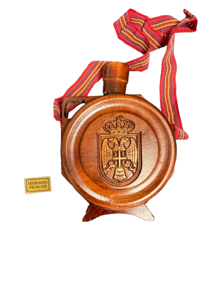 Traditionele Servische drankfles uit Niš, voorzien van een reliëf met het nationale wapen en het label “Memories from Niš”. Een authentiek souvenir dat verwijst naar internationale ontmoetingen en bezoeken in deze periode.