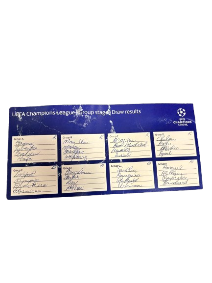 Officiële kaart met de lotingsresultaten van de UEFA Champions League groepsfase van bijwoning evenement in Monaco. Een uniek document dat de internationale context en tegenstanders van AZ in deze periode vastlegt