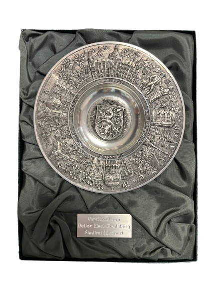 Decoratieve herdenkingsschaal uit de Oostenrijkse stad Graz, voorzien van reliëf met lokale bezienswaardigheden zoals het Rathaus en de Uhrturm. Het object werd geschonken door de sportwethouder van Graz aan AZ ter gelegenheid van een internationale ontmoeting.