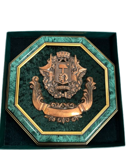 Decoratief plaquette met het stadswapen van Donetsk (Oekraïne), voorzien van het opschrift “ДОНЕЦК”. Een officieel relatiegeschenk dat verwijst naar een internationale ontmoeting in deze stad en de contacten van AZ in deze periode