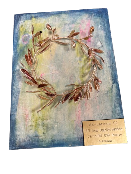 Decoratieve laurierkrans ter herinnering aan de UEFA Cup-wedstrijd AZ – Larissa FC (2007). Een symbolisch object dat de verbondenheid en het internationale karakter van de club onderstreept.