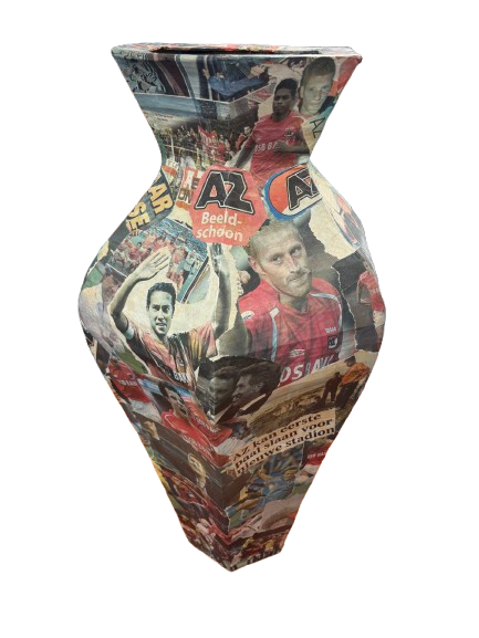 Handgemaakte vaas in papier-maché, opgebouwd uit een collage van AZ-spelers, logo’s en krantenbeelden. Een uniek object dat de geschiedenis en beleving van de club visueel samenbrengt.