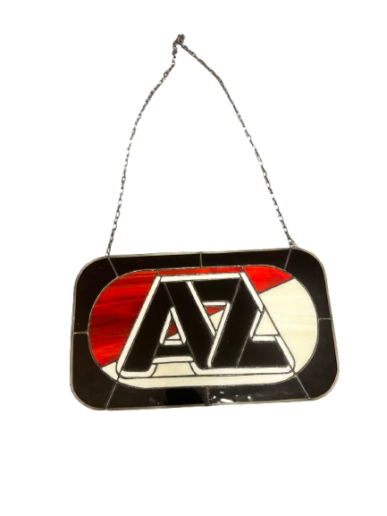 Hangend glasobject met het klassieke AZ ’67-logo, uitgevoerd in een glas-in-lood stijl. Een decoratief clubobject uit een eerdere periode van AZ.