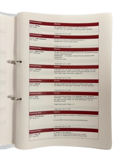 Verzamelmap met felicitaties van AZ-supporters naar aanleiding van het kampioenschap van AZ in het seizoen 2008–2009. Een uniek en persoonlijk document waarin de reacties en emoties van supporters uit deze periode zijn vastgelegd