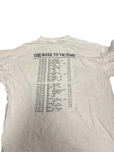 T-shirt met opschrift “The Road to Victory”, voorzien van een overzicht van wedstrijden en overwinningen uit het kampioensseizoen van AZ (2008–2009). Een bijzonder item dat de volledige route naar de landstitel vastlegt.