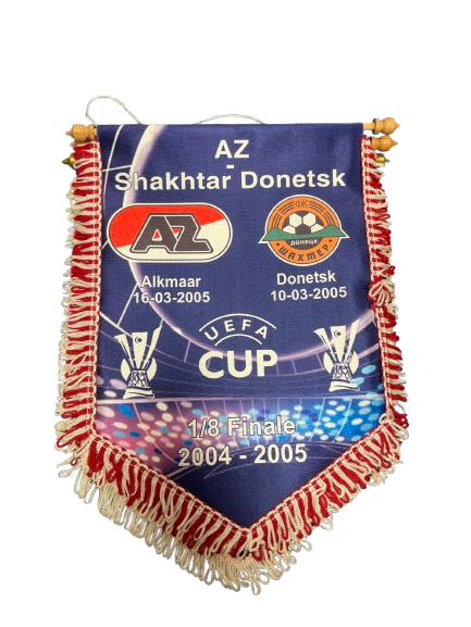 Wedstrijdvaantje van de UEFA Cup-wedstrijden tussen AZ en Shakhtar Donetsk in het seizoen 2004–2005 (1/8 finale). Vermeldt beide speeldatums in Alkmaar en Donetsk en vormt een tastbare herinnering aan deze Europese confrontatie.