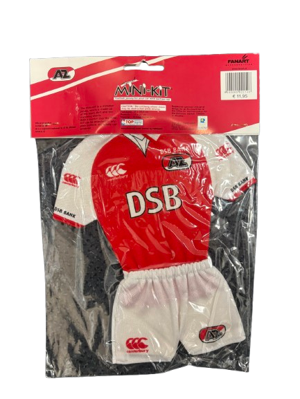 Mini-tenue van AZ in originele verpakking, uitgevoerd in het rood-witte thuisshirt met DSB-sponsor. Een officieel fanartikel uit de periode waarin AZ speelde met DSB Bank als hoofdsponsor.