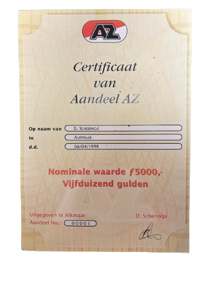 Certificaat van aandeel in AZ op naam van D. Scheringa, gedateerd 6 april 1998, met een nominale waarde van ƒ5000. Een officieel document dat de betrokkenheid bij de club in deze periode vastlegt.